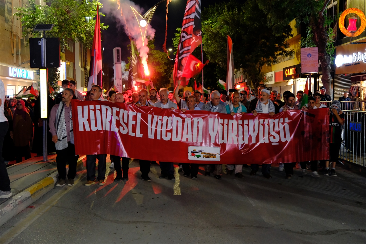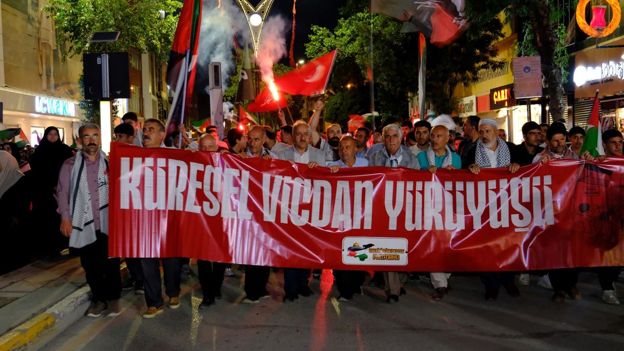 Filistin bayraklarıyla Beşyol Meydanı'nda bir araya gelenler, tekbir getirerek Cumhuriyet Caddesi'nde yürüdü. Kent Meydanı'nda sona eren yürüyüşün ardından Kur'an-ı Kerim okundu, dua edildi. Grup adına açıklama yapan platform sözcüsü Hayati Beyde, İsrail'in Gazze ve İran’a yönelik saldırılarını kınadı.