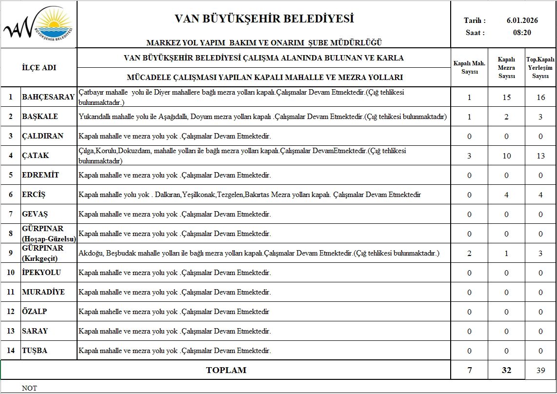 Van Büyükşehir Belediyesi, kent genelinde etkili olan kar yağışı sonrası yol açma ve karla mücadele çalışmalarını aralıksız sürdürüyor. Merkez Yol Yapım Bakım ve Onarım Şube Müdürlüğü tarafından paylaşılan 6 Ocak 2026 tarihli rapora göre, il genelinde 7 mahalle yolu ile 32 mezra yolu olmak üzere toplam 39 yerleşim yerinin yolu ulaşıma kapalı durumda olduğu açıklandı.