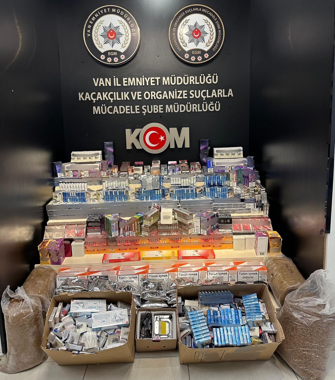 Van Emniyet Müdürlüğünden yapılan açıklamada, il genelinde Kaçakçılık ve Organize Suçlarla Mücadele Şube Müdürlüğü görevlilerince yürütülen çalışmaların devam ettiği belirtildi. Açıklamada, "5607 SKM suçu kapsamında yapılan çalışmalarda; 2 bin 613 adet puro, 8 bin 889 paket sigara, bin 537 litre akaryakıt, 220 adet elektronik sigara, 40 adet elektronik sigara likiti, 106 bin adet boş makaron, 28 bin 300 adet içi doldurulmuş makaron, 177 kilogram açık tütün, 5 adet sigara yapımında kullanılan makine, 16 adet cep telefonu, 15 adet kablosuz kulaklık ele geçirilmiştir.