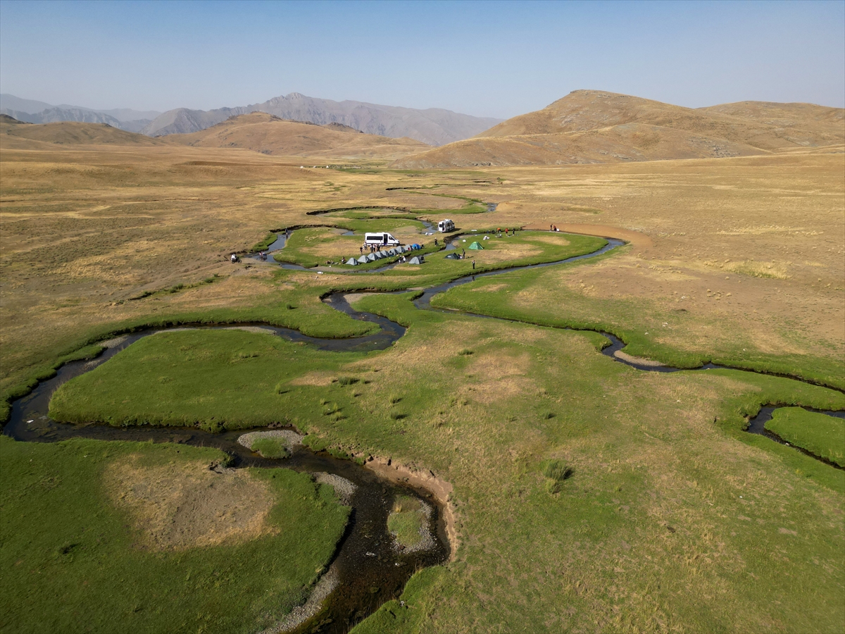 Van'da 2 bin 600 rakımlı Alandeşt Yaylası'na gelen doğaseverler, akarsuların oluşturduğu mendereslerin arasında kamp yaparak serin havanın tadını çıkarıyor. İlçeye 80 kilometre uzaklıktaki yaylaya gitmek isteyen ziyaretçiler, araçla varılan bölümden sonra patika yoldan yürüyerek su kaynaklarının olduğu bölgeye ulaşıyor. Temiz ve serin havası, menderesleri ve zengin bitki örtüsüyle insanları cezbeden yaylada çadır kuran ziyaretçiler, hem doğayla iç içe zaman geçiriyor hem de kamp yaparak yaylanın güzelliklerini keşfetme imkanı buluyor. Tesis edilen huzur ortamında rotasını yaylaya çeviren Vadi Doğa Sporları Kulübü üyesi 30 kişilik ekip de akarsuların oluşturduğu mendereslerin kenarında iki gün kamp yaparak, güzel manzarada serinledi.