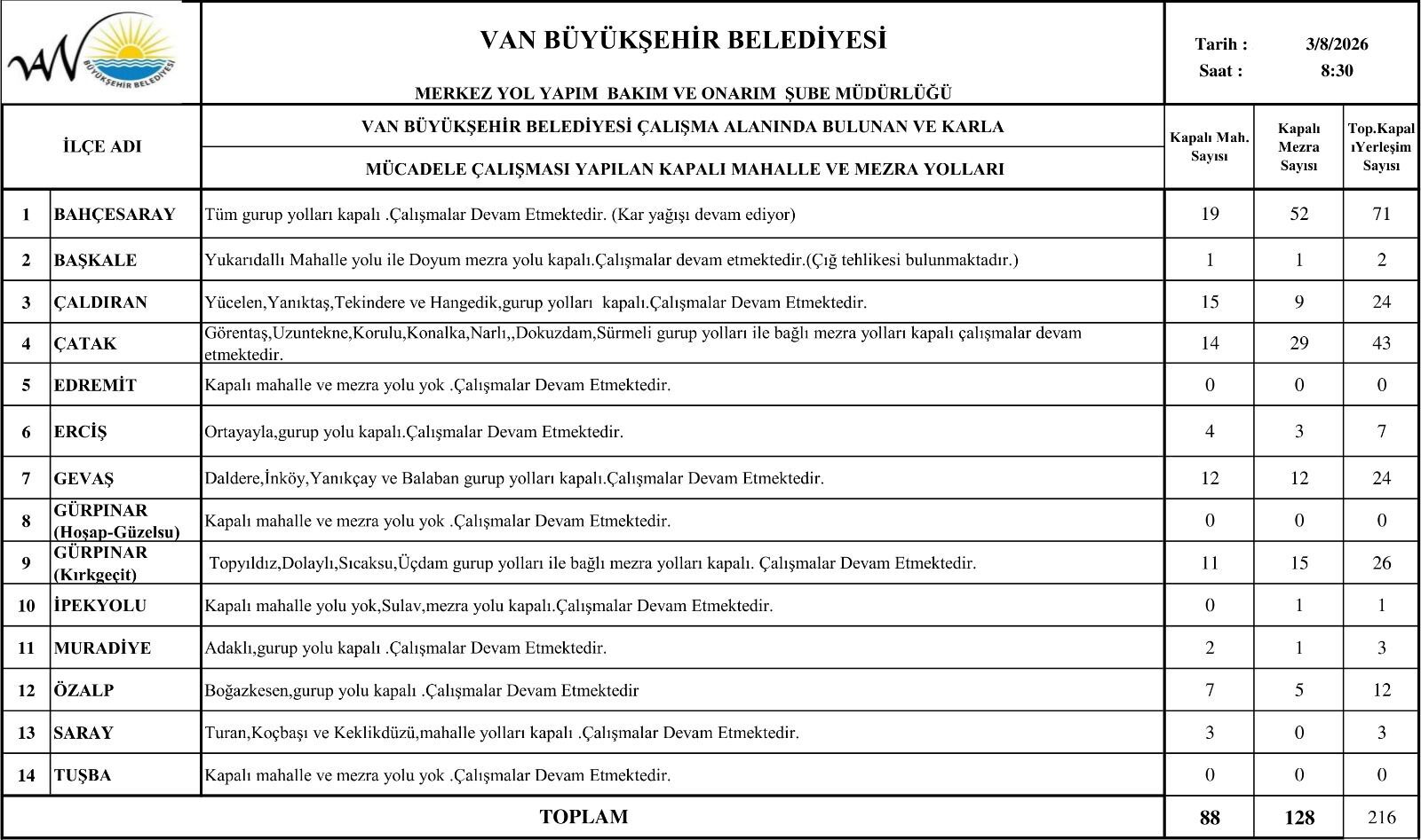 Açıklanan verilere göre kent genelinde 88 mahalle yolu ve 128 mezra yolu olmak üzere toplam 216 yerleşim yerinin yolu yoğun kar yağışı nedeniyle ulaşıma kapandı. Belediye ekipleri, kapanan yolların yeniden ulaşıma açılması için çalışmalarını aralıksız sürdürüyor.