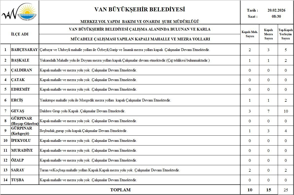Van'da etkili olan kar yağışı ve tipi nedeniyle kapanan 25 yerleşim yerinin yolunda çalışmalar aralıksız yürütülüyor. Son dönemde kentte etkili olan yoğun kar yağışı ulaşımı olumsuz etkiliyor. Van ve çevresinde etkili olan sert kış şartları mücadelesi hız kesmeden devam ediyor. Kar yağışı ile birlikte Gevaş 10, Gürpınar 4 Bahçesaray'da 5, Başkale'de 2, Erciş'te 2 ve Saray ilçesinde ise 2 olmak üzere toplam 25 yerleşim yerinin yolu ulaşıma kapandı. Ekipler, yoğun bir çalışma sonucu kapanan yerleşim yerinin yolunu açmak üzere çalışmalar devam ediyor.