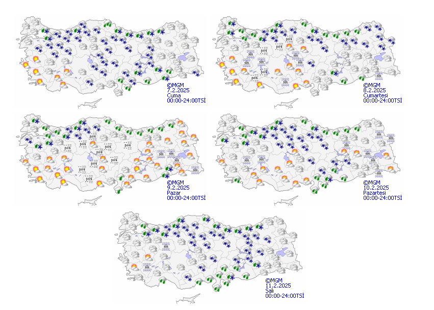 Meteoroloji, ülkemiz genelinin parçalı ve çok bulutlu, Marmara’nın doğusu, İç Anadolu’nun doğusu, Karadeniz, Doğu ve Güneydoğu Anadolu ile Hatay ve Kütahya çevreleri, Kahramanmaraş ve Osmaniye'nin doğusu, Eskişehir'in batısının yağışlı geçeceği tahmin ediliyor. Yağışların; Hatay çevreleri ile Güneydoğu Anadolu'nun güneyinde yağmur, yağış alan diğer yerlerde karlakarışık yağmur ve kar şeklinde olmak üzere Doğu Anadolu'nun batısı, Doğu Karadeniz'in iç kesimleri ile Kocaeli, Sakarya, Yalova, Bursa, Zonguldak, Bartın, Düzce, Kastamonu'nun kıyı kesimleri, İstanbul’un iç ve yüksek kesimleri, Hakkari ve Şırnak çevrelerinde kuvvetli olması bekleniyor. Rüzgarın Marmara, Ege, Akdeniz, İç Anadolu’nun güney ve doğusunda kuzeyli yönlerden fırtına, yer yer kuvvetli fırtına (50-60, yer yer 90 km/sa) şeklinde eseceği tahmin ediliyor. Sabah ve gece saatlerinde iç ve doğu kesimlerde buzlanma ve don ile birlikte pus ve yer yer sis bekleniyor. Doğu Karadeniz’in iç kesimlerinin yüksekleri ile Doğu Anadolu’nun yüksek ve dik yamaçlarında çığ tehlikesi bulunmaktadır. Hava sıcaklığının kuvvetli kuzeyli rüzgar ve ani sıcaklık düşüşü ile birlikte özellikle kuzeybatı kesimlerde hissedilir derecede olmak üzere, kuzey, iç ve batı bölgelerde 4 ila 10 derece azalacağı tahmin ediliyor. Rüzgarın genellikle kuzey ve kuzeydoğu yönlerden hafif, ara sıra orta kuvvette, Marmara, Ege, Akdeniz, İç Anadolu’nun güney ve doğusunda fırtına (50-60, yer yer 90 km/sa) şeklinde esmesi bekleniyor.