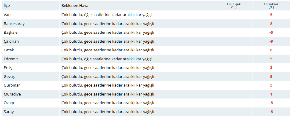 Çok bulutlu, bölgenin genelinin aralıklı karla karışık yağmur ve kar yağışlı geçeceği tahmin ediliyor. Yağışların, bölgenin batısı ve Hakkari çevreleri ile Şırnak'ın doğusunda yer yer kuvvetli kar yağışı şeklinde olması bekleniyor. Bölgede buzlanma ve don ile birlikte sabah saatlerinde pus ve yer yer sis bekleniyor. Bölgenin doğusunun dik ve eğimli yamaçlarında çığ tehlikesi bulunmaktadır.