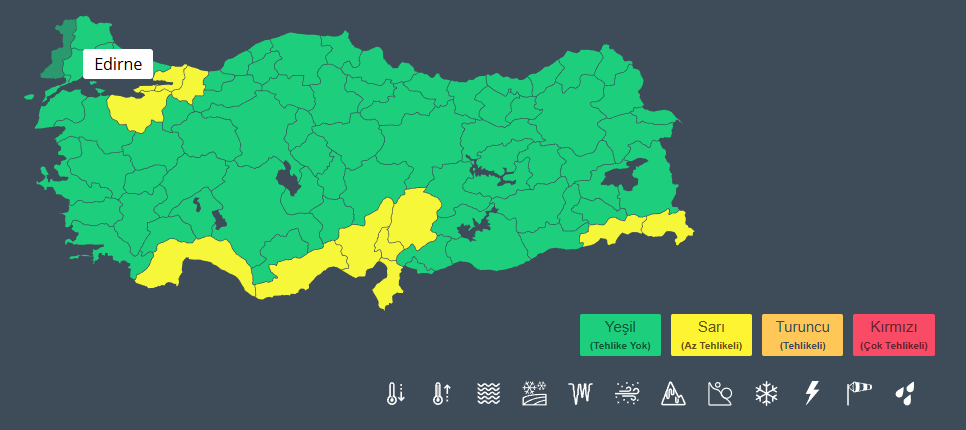 Adana, Antalya, Bursa, Hakkari, Hatay, Mersin, Kocaeli, Kahramanmaraş, Sakarya, Şırnak, Yalova ve Osmaniye dahil 12 il için sarı kod uyarısı yapıldı.