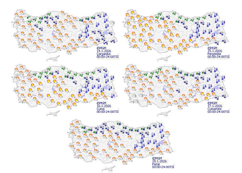 Meteorolojiden yapılan tahminlere göre: Ülke genelinde havanın parçalı ve çok bulutlu olması beklenirken Marmara’nın doğusu, Batı Karadeniz, Doğu Karadeniz kıyıları, Doğu Anadolu'nun güneydoğusu ile Ankara, Eskişehir, Batman, Siirt çevrelerinin yağışlı; kıyıların karla karışık yağmurlu, iç kesimlerin kar yağışlı geçeceği tahmin ediliyor. Yağışların, Hakkari ve Şırnak çevreleri ile Siirt'in doğu ilçelerinde yoğun kar şeklinde görülmesi bekleniyor. Rüzgarın, Güney Ege ile Akdeniz’in iç kesimlerinde kuzeyli yönlerden kuvvetli ve kısa süreli fırtına (50-70 km/sat) şeklinde esmesi tahmin ediliyor. Doğu Karadeniz’in iç kesimlerinin yüksekleri ile Doğu Anadolu’nun doğusunda yüksek kar örtüsüne sahip eğimli kesimlerinde çığ tehlikesi bulunmaktadır. Sabah ve gece saatlerinde iç ve doğu bölgelerde buzlanma ve don olayı bekleniyor. Hava sıcaklıkların, batı kesimlerde 4 ila 6 derece artacağı, doğu kesimlerde 3 ila 5 derece azalacağı, diğer yerlerde önemli bir değişiklik olmayacağı tahmin ediliyor. Rüzgarın, Marmara ve Karadeniz'de güneyli, diğer yerlerde kuzey ve doğulu yönlerden hafif, yer yer orta kuvvette, Güney Ege ile Akdeniz’in iç kesimlerinde kuvvetli ve kısa süreli fırtına (50-70 km/sat) şeklinde esmesi bekleniyor.