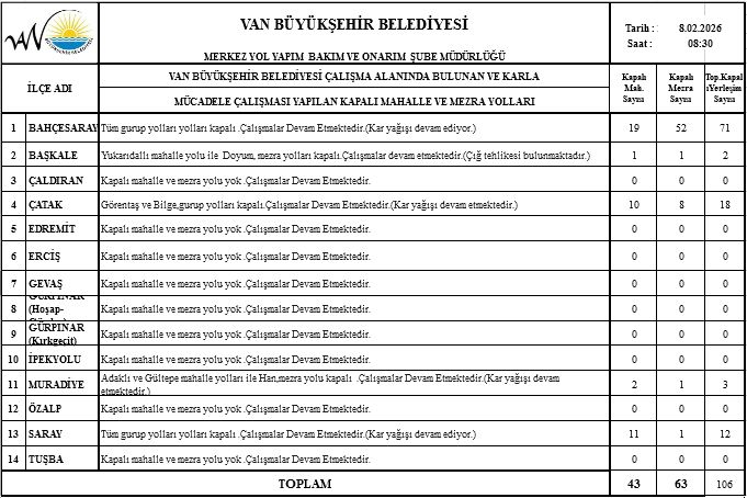 Kar yağışı nedeniyle Bahçesaray’da 71, Çatak’ta 18, Saray’da 12, Muradiye’de 3 ve Başkale’de 2 olmak üzere toplam 106 yerleşim yerinin yolu ulaşıma kapandı. Kapanan yolların açılması için Büyükşehir Belediyesi ve ilçe belediyelerine bağlı karla mücadele ekipleri çalışma başlattı.