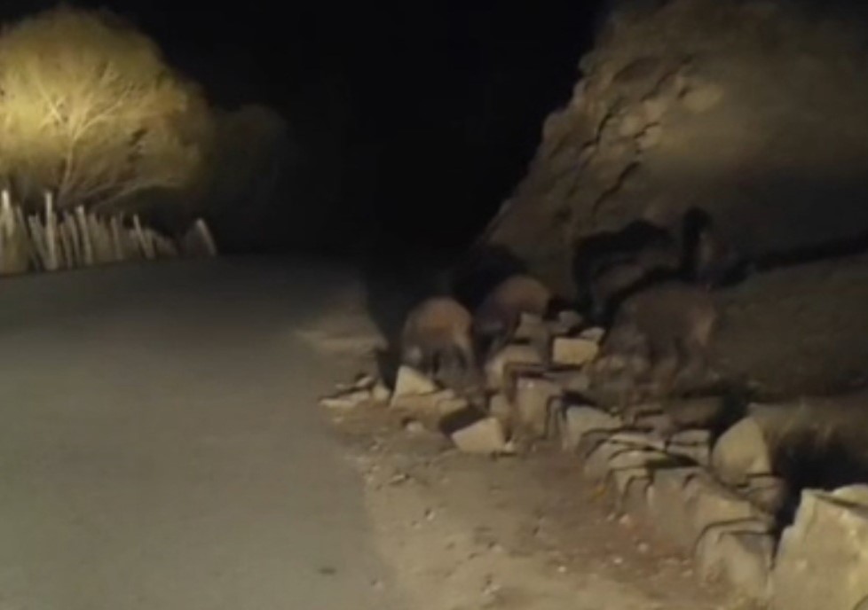 Mahallede ikamet eden Mustafa Özdemir, yolun kenarında yiyecek arayan sürüyü cep telefonu kamerasıyla görüntüledi. Yaklaşık 10 domuzun bulunduğu sürü, yolun karşısına geçtikten sonra gözden kayboldu.
