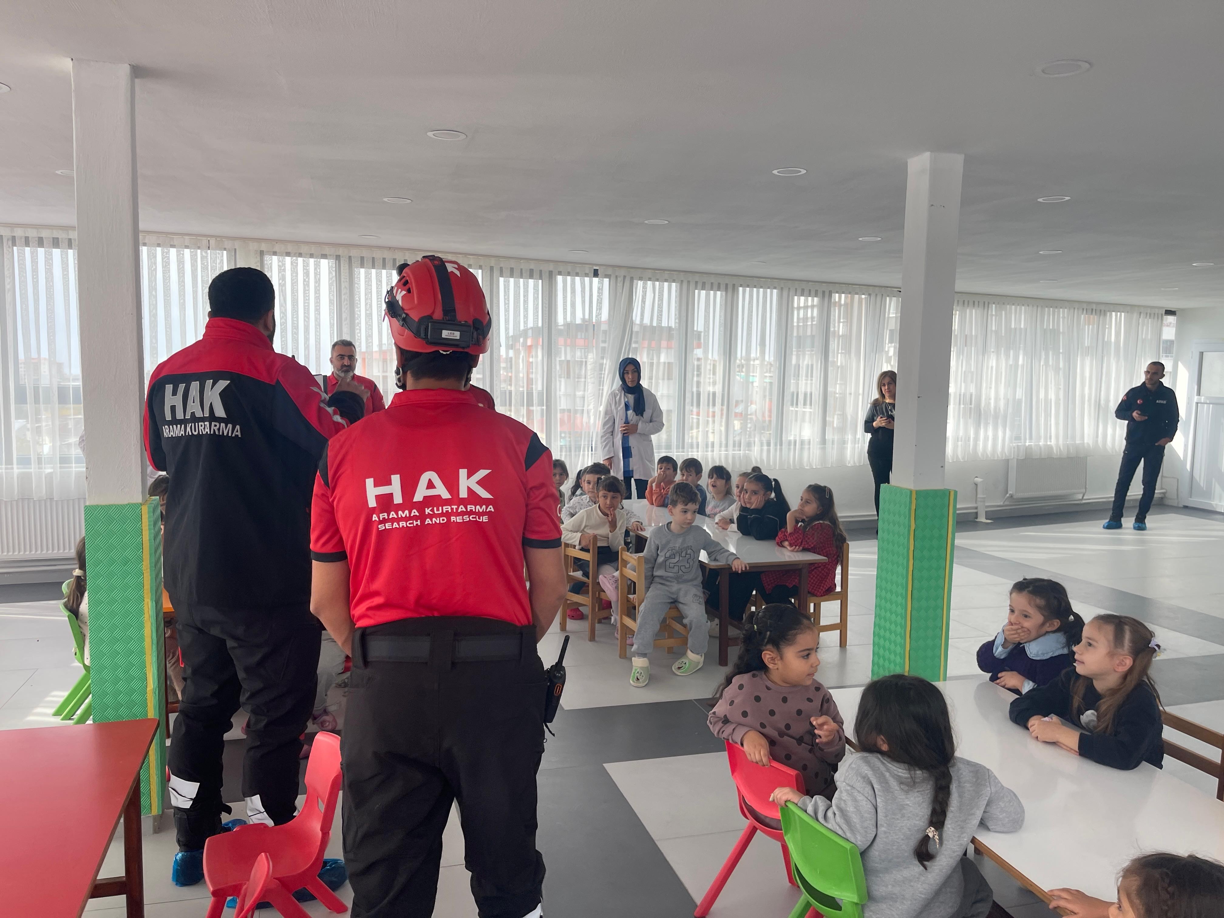 HAK Arama Kurtarma ekipleri tarafından hazırlanan sunumlarla çocuklara afet anında panik yapmadan güvenli davranışların önemi vurgulandı. Daha sonra öğrencilerle birlikte "çök-kapan-tutun" tatbikatı yapılarak deprem anında nasıl korunmaları gerektiği uygulamalı olarak gösterildi. Arama kurtarma personeli, miniklerin ilgisini çekmek amacıyla kullanılan ekipmanları tanıttı ve çocukların merak ettiği soruları yanıtladı.