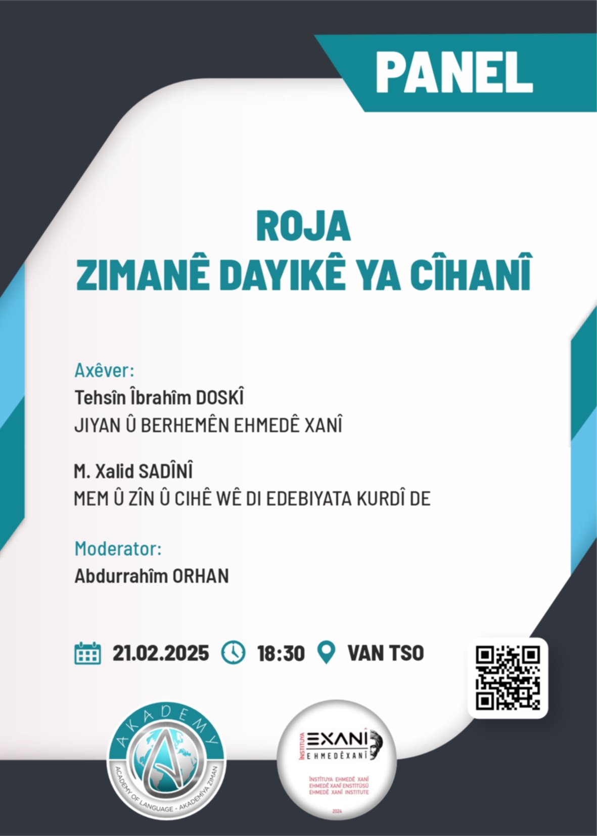 Ehmedê Xanî Enstitüsü ve Akademy tarafından 21 Şubat 2025 tarihinde Van Ticaret ve Sanayi Odası (Van TSO) binasında saat 18.30’da “Roja Zimanê Dayîkê ya Cîhanî’” başlıklı bir panelde düzenleyecek.