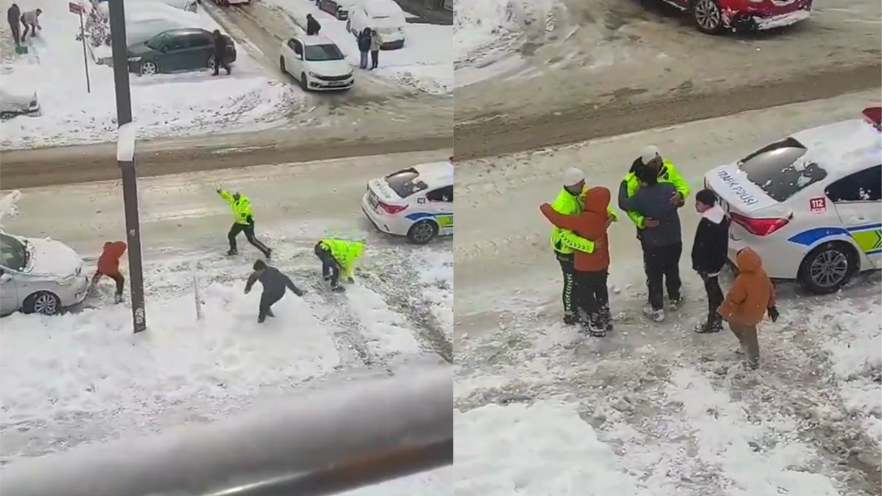 Van’da kar yağışının ardından ortaya çıkan beyaz örtü, sıcak anlara sahne oldu. Kent merkezinde görev yapan trafik polisleri, sokakta kar topu oynayan çocukların neşesine ortak oldu. Kısa sürede eğlenceli bir kar topu savaşına dönüşen anlar, çevredeki vatandaşların da ilgisini çekti.