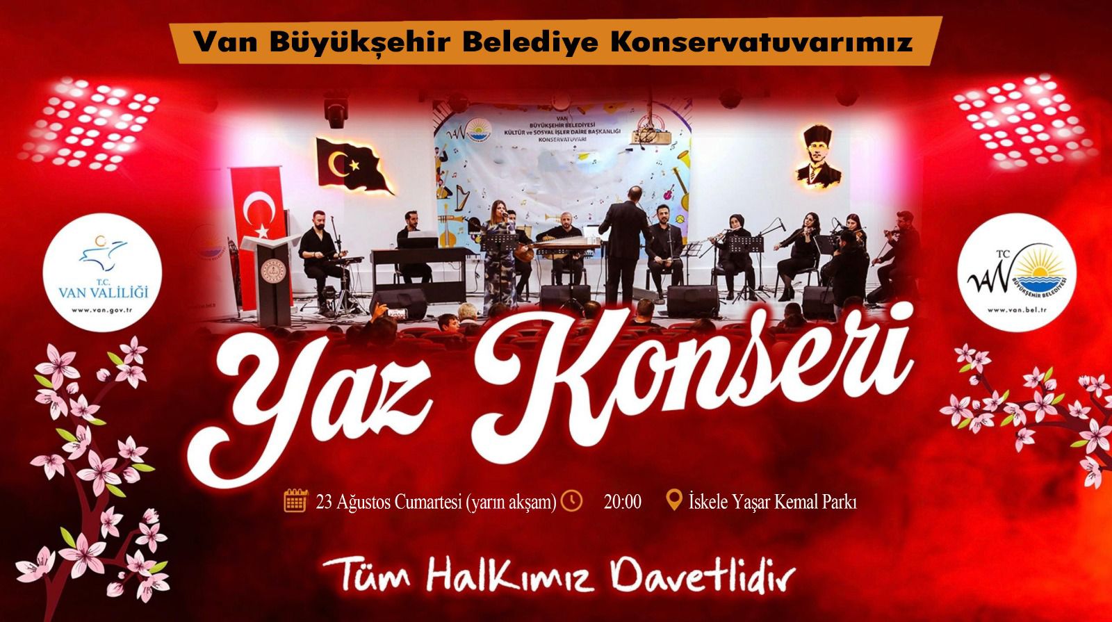 23 Ağustos Cumartesi günü (yarın akşam) İskele Yaşar Kemal Parkında gerçekleştirilecek olan konser saat 20.00'da başlayacak. Konserde günün sevilen şarkıları, Van türküleri ile çeşitli yörelere ait türküler seslendirilecek. Büyükşehir Belediyesinden yapılan açıklamada, Ücretsiz düzenlenecek olan konsere tüm vatandaşlar davet edildi.