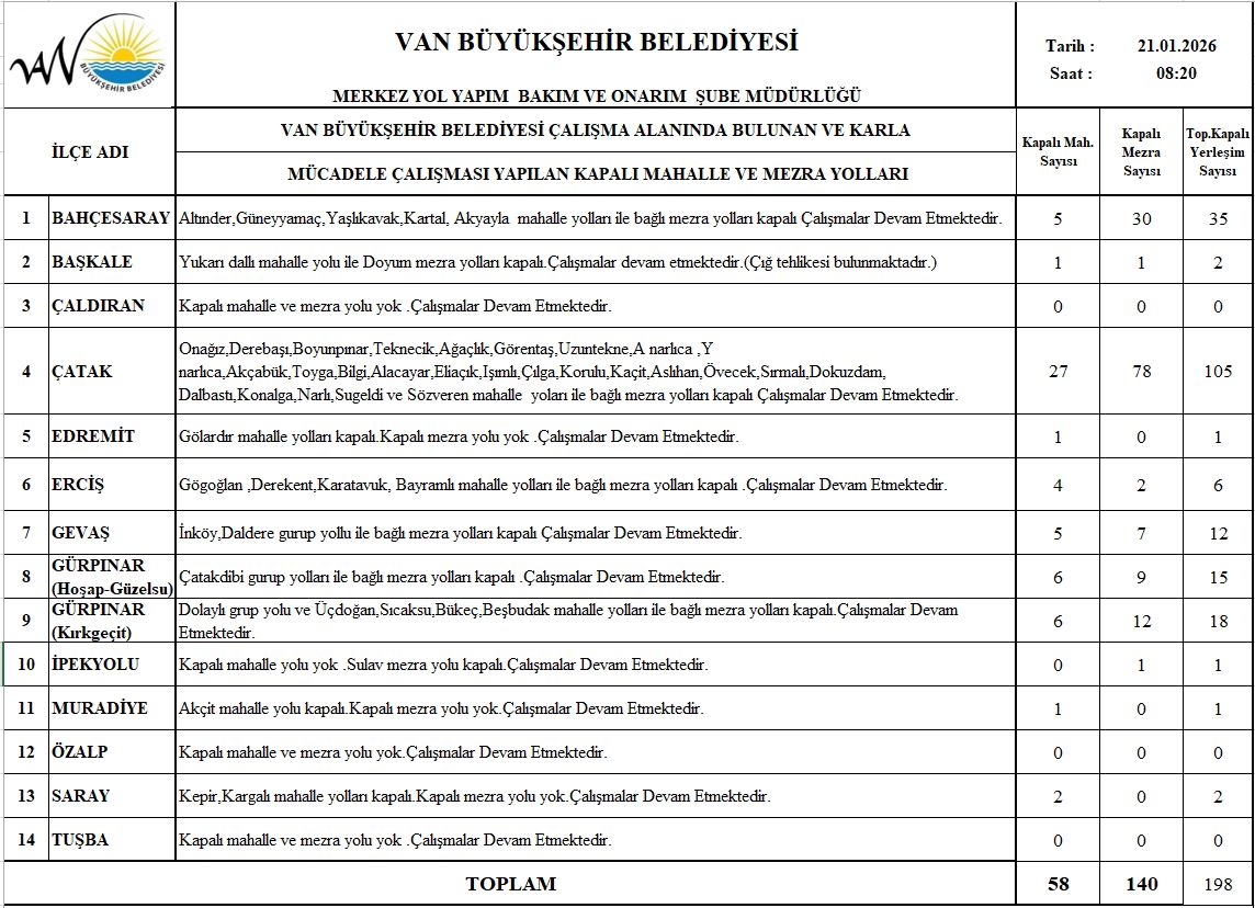 Van Büyükşehir Belediyesinden yapılan göre; Bahçesaray ilçesinde 35, Başkale ilçesinde 2, Çatak ilçesinde 105, Edremit ilçesinde 1, Erciş ilçesinde 6, Gevaş ilçesinde 12, Gürpınar ilçesinde 33, İpekyolu ilçesinde 1, Muradiye ilçesinde 1 ve Saray ilçesinde 2 yerleşim yeri yolu ulaşıma kapalı bulunuyor.