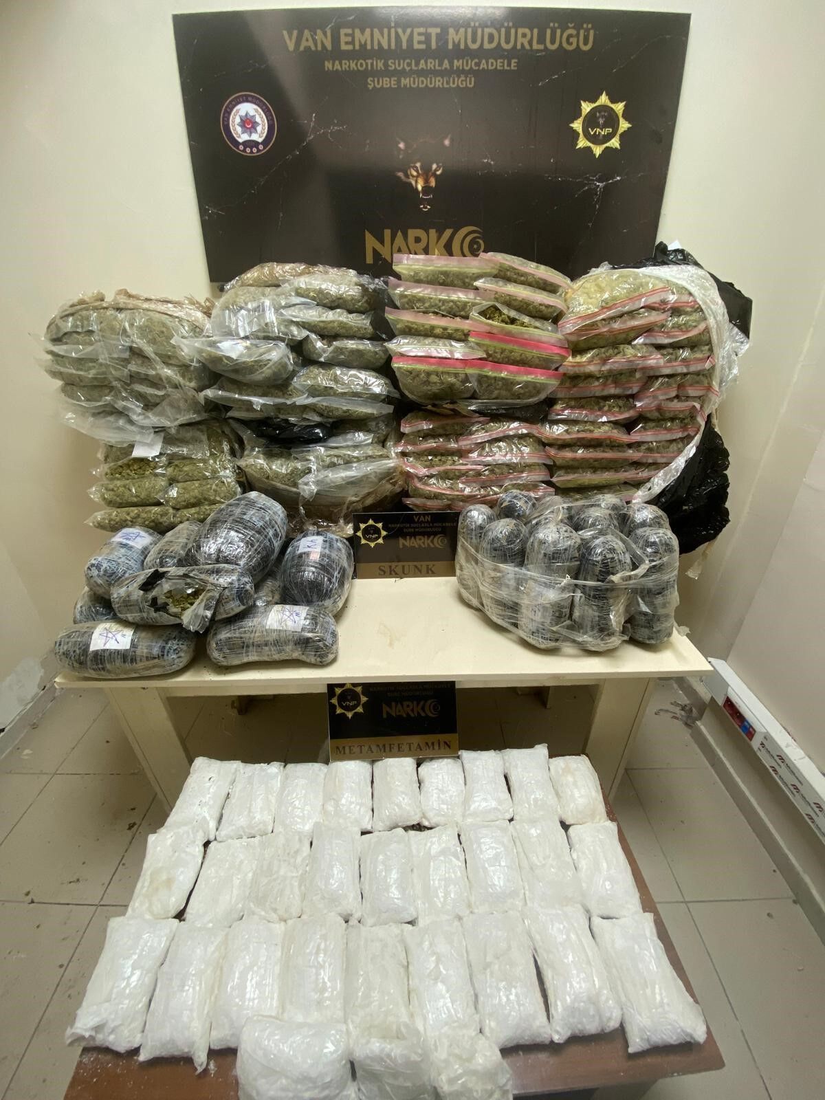 Van’da polis ekiplerince yürütülen çalışmalar sonucunda 89 kilo 434 gram uyuşturucu ve 162,92 litre asetik anhidrit maddesi ele geçirildi.