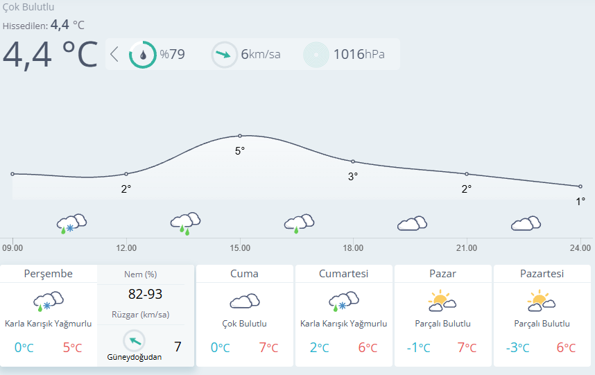 Çatak: Çok bulutlu, aralıklı karla karışık yağmur ve kar yağışlı. Yağışlar öğle saatlerine kadar kuvvetli