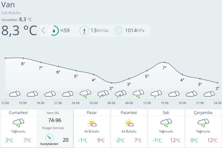Meteorolojiden yapılan son hava tahminlerine göre; Van’da havanın parçalı ve çok bulutlu olması beklenirken akşam ve gece saatlerinden itibaren tüm ilçelerde sağanak ve kar yağışı bekleniyor. Kar yağışının Cumartesi günü de kent genelinde etkili olması beklenen yağışlı havanın Pazar ve Pazartesi günleri kenti terk edeceği tahmin ediliyor. Salı günü yeniden kentin sağanak yağış ve karla karışık yağmurun etkili altına girmesi beklenirken yağışların önümüzdeki Cuma güne kadar aralıklarla kent genelinde etkili olması bekleniyor.