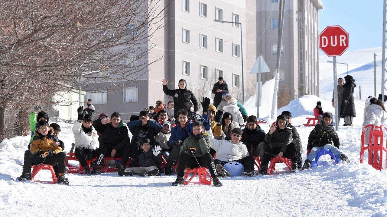 Van'ın Edremit ilçesinde karın ardından güneşli havayı fırsat bilen çocuklar, kayak pistine dönüştürdükleri tepeden kızaklarıyla kayarak keyifli anlar yaşıyor. Kavurma Mahallesi'nde bir araya gelen çocuklar ve gençler, karın ardından kullanılmayan yokuşlu yolu kendi imkanlarıyla kayak pistine dönüştürdü.