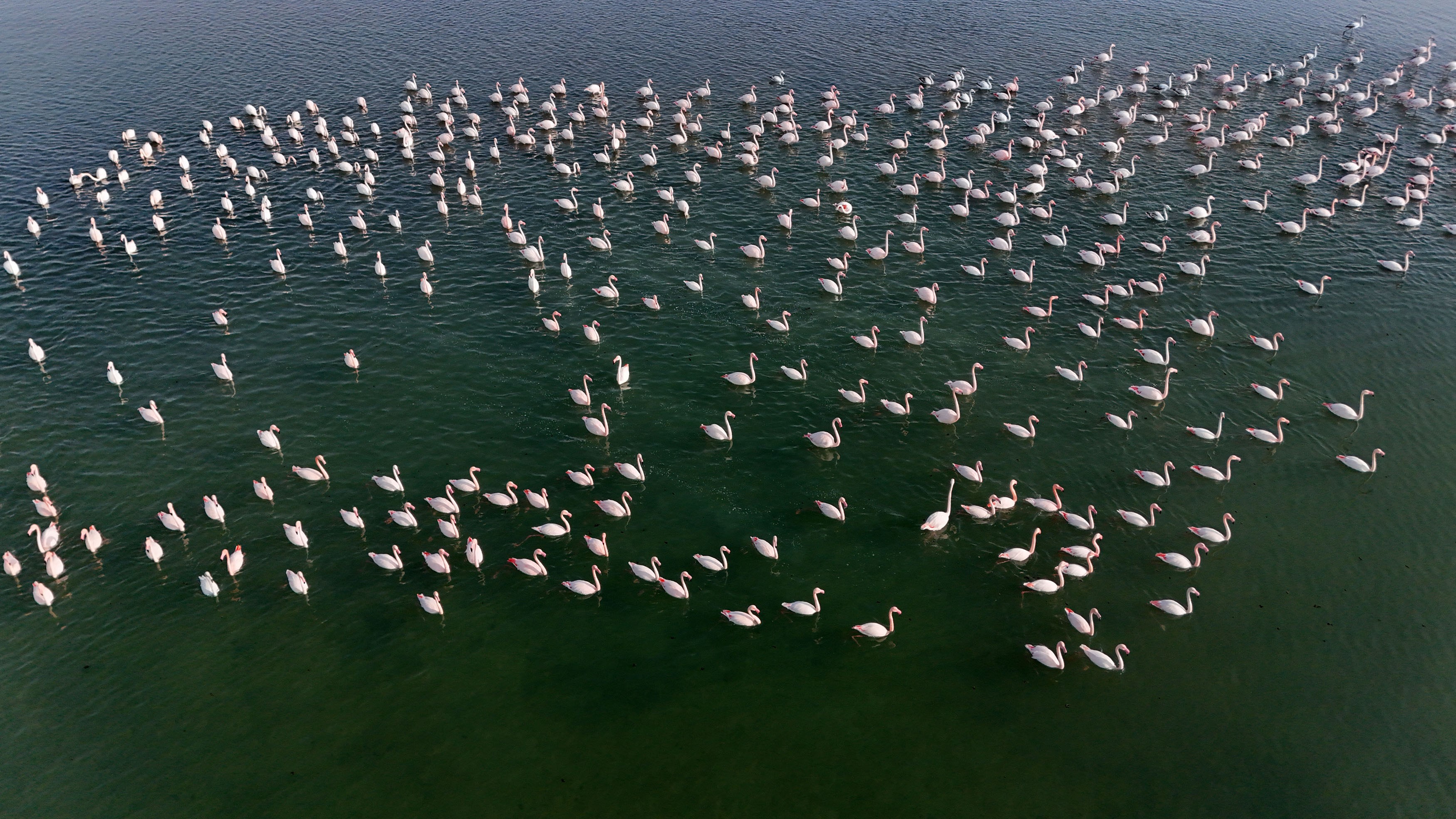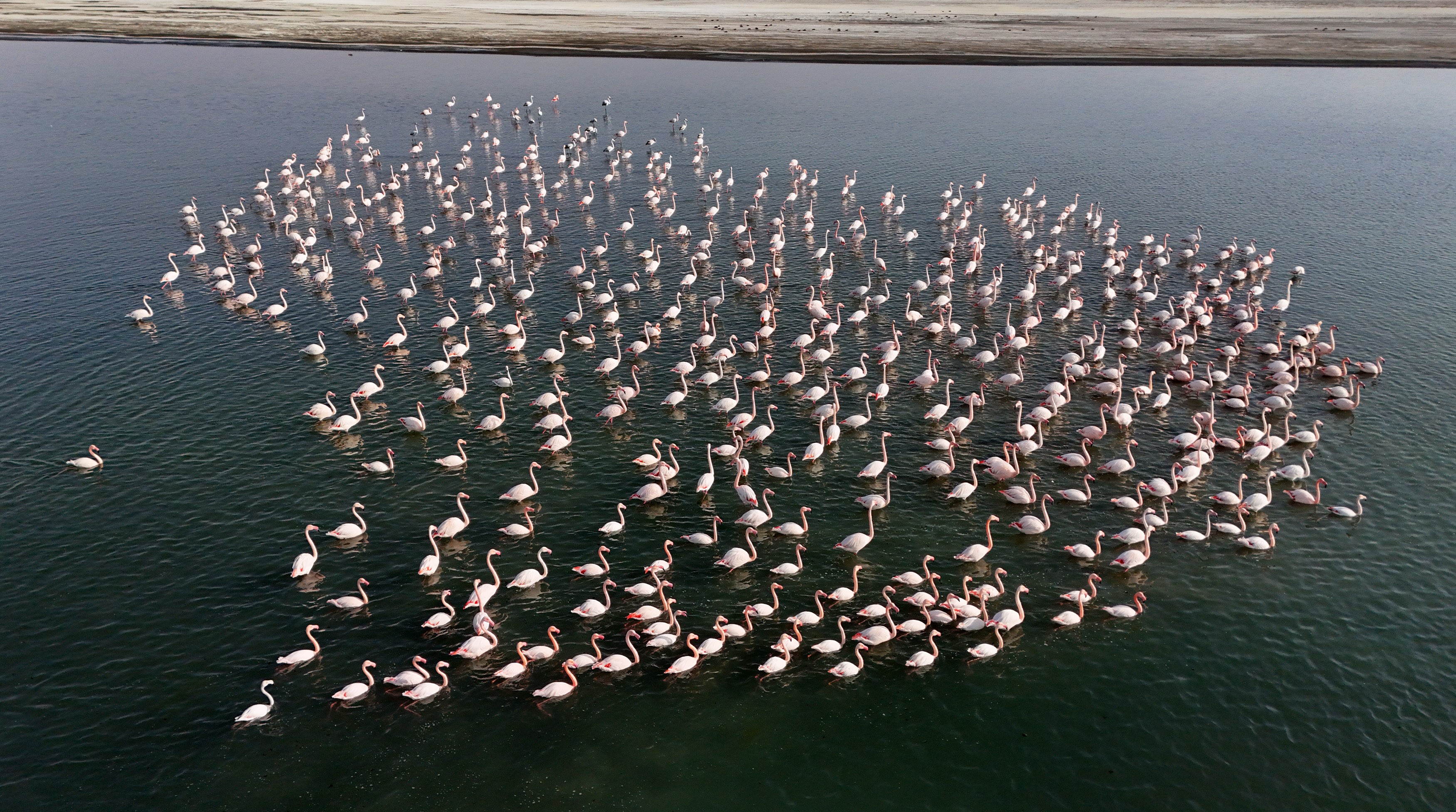 Pembe tüyleri, uzun zarif boyunları ve estetik duruşlarıyla doğa tutkunlarının gözdesi olan flamingolar, hava sıcaklığının mevsim normallerinin üzerinde seyrettiği bölgede konaklama sürelerini uzattı. Başta İran'ın Urumiye Gölü olmak üzere birçok gölün kuruması sonrası Van Gölü kıyıları ve Erçek Gölü’nde konaklayan flamingolar bölge ekosistemine canlılık katmaya devam ediyor. Suya düşen nazlı gölgeleri ve sakin danslarıyla Erçek Gölü’nde görsel şölen oluşturan flamingolar havadan dronla görüntülendi.