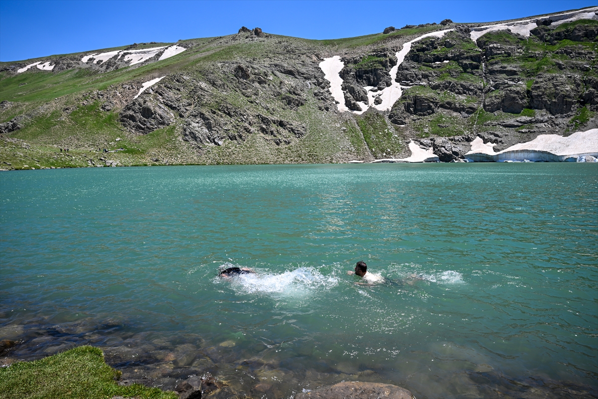 Türkiye'nin en yüksek rakımlı göllerinden biri olan buzul gölünde yüzerek serinleyen doğaseverler, huzurlu bir ortamda halay çekerek keyifli vakit geçirdi.