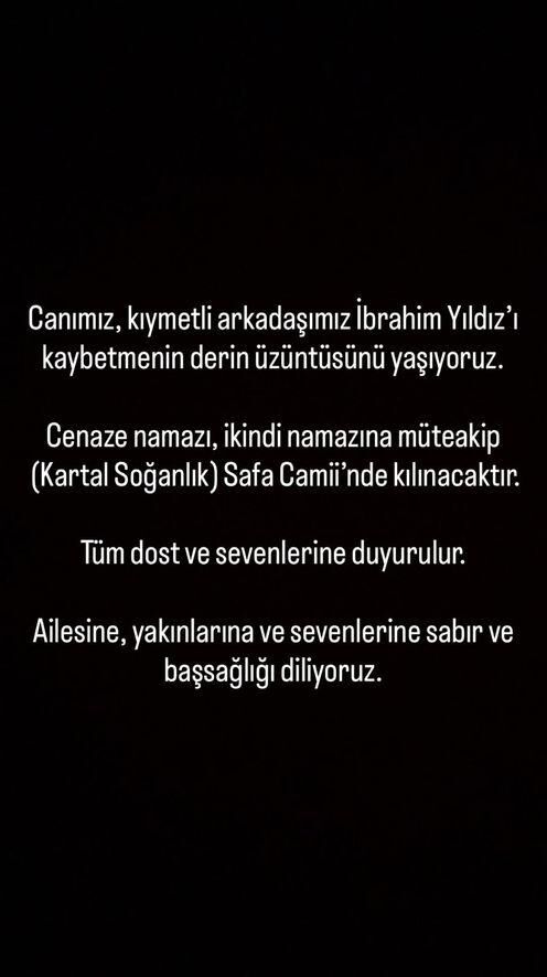 Ünlü oyuncu Alina Boz, meslektaşının vefat ettiğini duyurdu. Boz, sosyal medya hesabından yaptığı paylaşımda, "Canımız, kıymetli arkadaşımız İbrahim Yıldız'ı kaybetmenin derin üzüntüsünü yaşıyoruz. Cenaze namazı, ikindi namazına müteakip (Kartal Soğanlık) Safa Camii'nde kılınacaktır. Tüm dost ve sevenlerine duyurulur. Ailesine, yakınlarına ve sevenlerine sabır ve başsağlığı diliyoruz" ifadelerine yer verdi.
