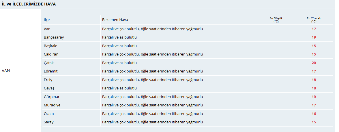 Yağmurun Van merkez, Çaldıran, Edremit, Erciş, Gürpınar, Muradiye, Özalp ve Saray ilçelerinde görülmesi tahmin ediliyor.