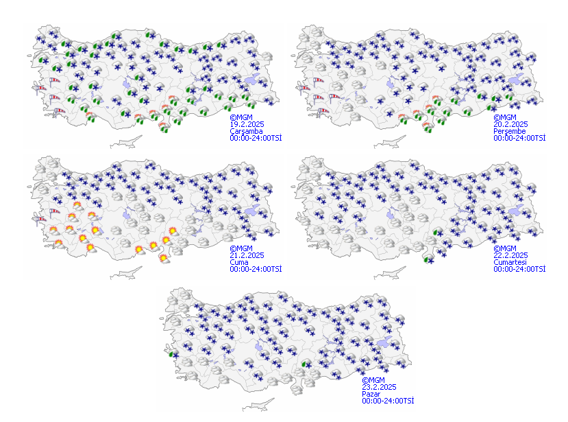 Meteorolojiden yapılan tahminlere göre: Ülkemiz genelinin parçalı ve çok bulutlu, Marmara, Ege, Akdeniz (Hatay hariç), İç Anadolu, Karadeniz, Doğu Anadolu’nun batısı ile Erzurum, Ardahan, Muş ve Bingöl çevreleri, Diyarbakır ve Adıyaman'ın kuzey kesimlerinin yağışlı geçeceği tahmin ediliyor. Kıyılarda yağmur, iç kesimlerde karla karışık yağmur ve kar şeklinde görülecek olan yağışların; Orta Karadeniz ile Yozgat, Sivas, Trabzon ve Giresun çevrelerinde yerel kuvvetli olması bekleniyor. Rüzgarın, Batı Karadeniz’in kuzeyli yönlerden kuvvetli olarak (40-60 km/saat) esmesi bekleniyor. Gece ve sabah saatlerinde iç ve doğu kesimlerde buzlanma ve don olayı bekleniyor. Doğu Karadeniz’in iç kesimlerinin yüksekleri ile Doğu Anadolu’nun yüksek ve dik yamaçlarında çığ tehlikesi bulunmaktadır. Hava Sıcaklıkların, İç Ege, İç Anadolu ile Karadeniz kıyılarında 2-4 derece azalacağı, diğer yerlerde önemli bir değişiklik olmaması beklenirken rüzgarın genellikle güneyli, zamanla yurdun batı kesimlerinde kuzeyli yönlerden, hafif, ara sıra orta kuvvette, Batı Karadeniz kıyılarında kuzey yönlerden yer yer kuvvetli (40-60 km/sa) olarak esmesi bekleniyor.