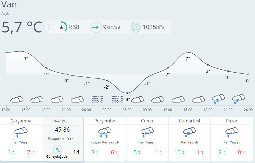 Van, Şubat ayı ortasından adeta bahar havasını yaşıyor… Kent genelinde gündüz saatlerinde hava sıcaklığı 5 derecelere kadar çıkarken Meteoroloji yayımladığı yeni hava durumunda Van’da beklenen kar yağışının bu gece itibarıyla kent genelinde etkili olacağını duyurdu. Van’da kent genelinde etkili olacak kar yağışının önümüzdeki 5 gün boyunca etkili olacağını duyururken kar yağışın Van’ın tüm ilçelerinde etkili olacak.