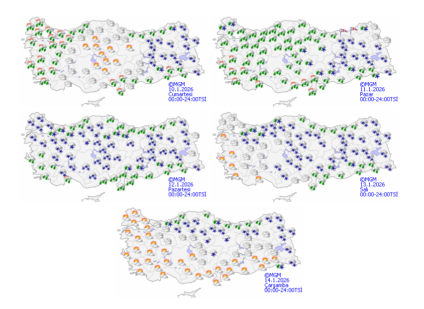 Meteorolojiden yapılan son hava tahminlerine göre: Ülke genelinde havanın parçalı ve çok bulutlu olması beklenirken Marmara, Ege, Akdeniz, Batı Karadeniz (Sinop hariç), Güneydoğu Anadolu'nun batısı ile Eskişehir, Çankırı, Ordu, Rize ve Artvin çevrelerinin yağmur ve sağanak yağışlı, Doğu Anadolu'nun doğusunun karla karışık yağmur ve kar yağışlı geçeceği tahmin ediliyor. Yağışların; Marmara'nın güney ve batısı ile Kıyı Ege'de yerel kuvvetli olması bekleniyor. Sabah ve gece saatlerinde iç ve doğu kesimlerde buzlanma ve don olayı ile birlikte pus ve yer yer sis bekleniyor. Doğu Karadeniz’in iç kesimlerinin yüksekleri ile Doğu Anadolu’nun doğusunun yüksek kar örtüsüne sahip eğimli kesimlerinde çığ tehlikesi bulunmaktadır. Hava sıcaklığının mevsim normalleri civarında seyredeceği tahmin edilirken rüzgarın genellikle güneyli yönlerden hafif ve orta kuvvette, Marmara, Ege, Batı Akdeniz, İç Anadolu'nun kuzey ve batısı ile Karadeniz'in iç kesimlerinde kuvvetli ve yer yer fırtına (40-80 km/saat) şeklinde esmesi bekleniyor.