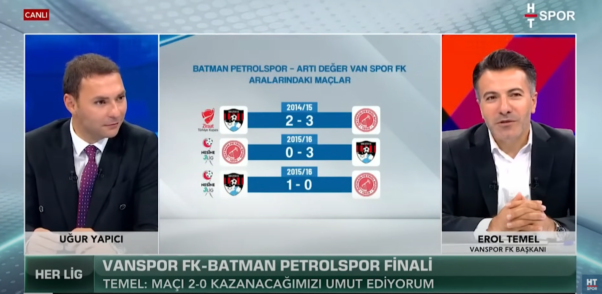 Nesine 2.Lig’de play-off yarı final maçlarının sona ermesiyle play-off finaline çıkan takımlar belli olurken finalin adı Batman Petrolspor-Vanspor oldu. Pazar günü saat 20:00’da Kayseri Kadir Has Stadyumunda oynanacak maç öncesi HT Spor’a konuk olan Vanspor FK Başkanı Erol Temel kritik karşılaşmaya dair değerlendirmelerde bulundu ve skor tahminini de paylaştı.