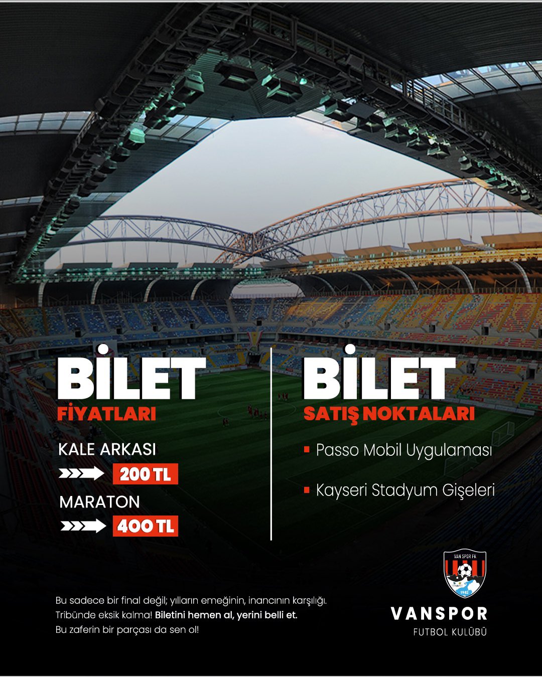 Doğu ve Kuzey tribünleri Vansporumuza ayrılmıştır. Biletler, Passo Lig üzerinden ve stadyum gişelerinden temin edilebilir. Haydi Van, finalde yerimizi alalım!