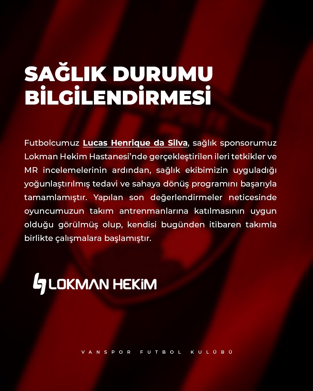 Vanspor’dan yapılan açıklamada; “Futbolcumuz Lucas Henrique da Silva, sağlık sponsorumuz Lokman Hekim Hastanesi'nde gerçekleştirilen ileri tetkikler ve MR incelemelerinin ardından, sağlık ekibimizin uyguladığı yoğunlaştırılmış tedavi ve sahaya dönüş programını başarıyla tamamlamıştır. Yapılan son değerlendirmeler neticesinde oyuncumuzun takım antrenmanlarına katılmasının uygun olduğu görülmüş olup, kendisi bugünden itibaren takımla birlikte çalışmalara başlamıştır” denildi.