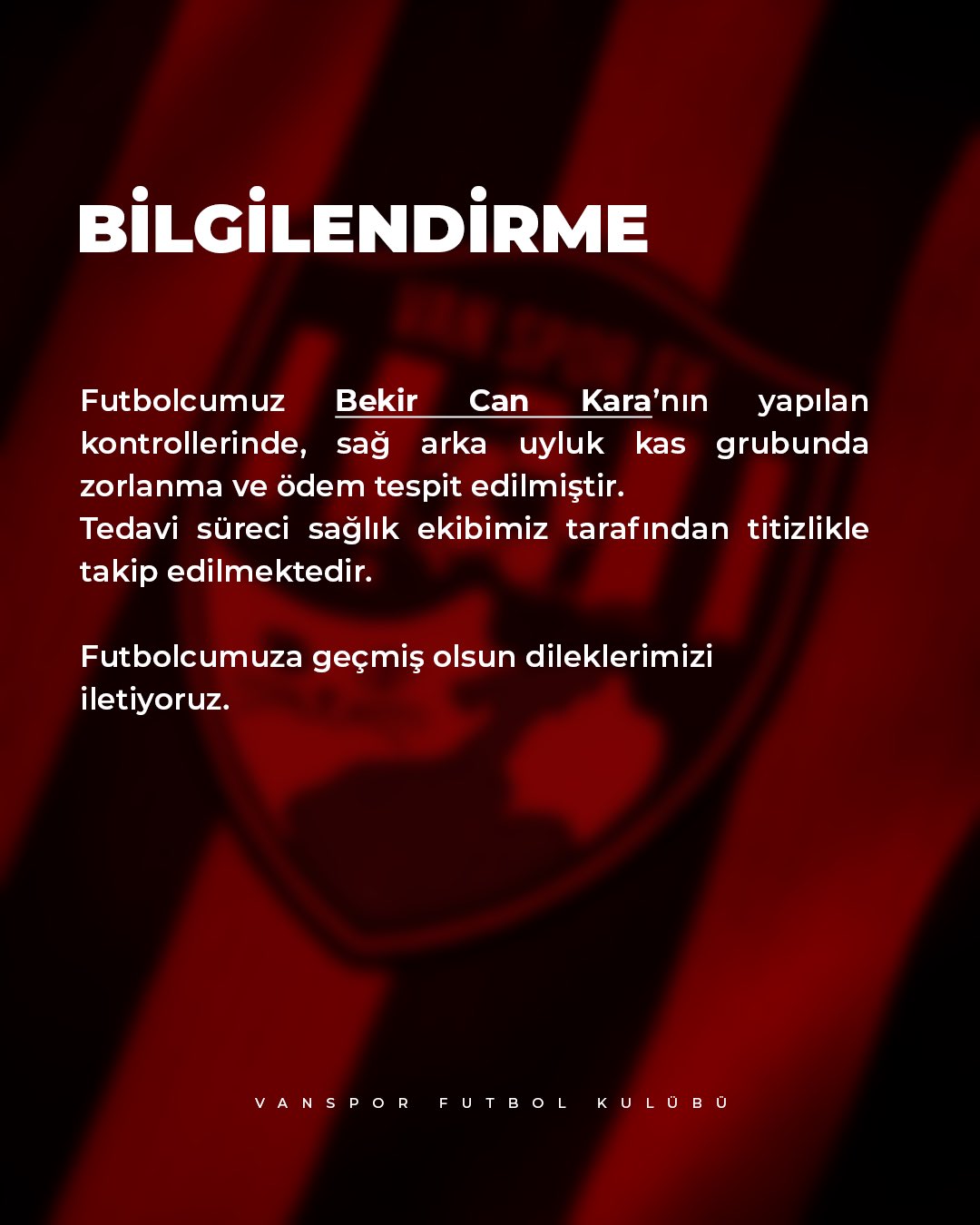 Vanspor’da ligin en kritik maçı olan Sarıyerspor maçı öncesi şok bir sakatlık haberiyle sarsıldı. Vanspor’da son haftaların formda ismi Bekircan Kara sakatlandı. İvan Cedric’in sarı kart cezalısı olmasının yanı sıra kadroda Bekircan Kara’nın da olması can sıktı. Sakatlanan Bekircan Kara’nın tedavisine ise başlandı.