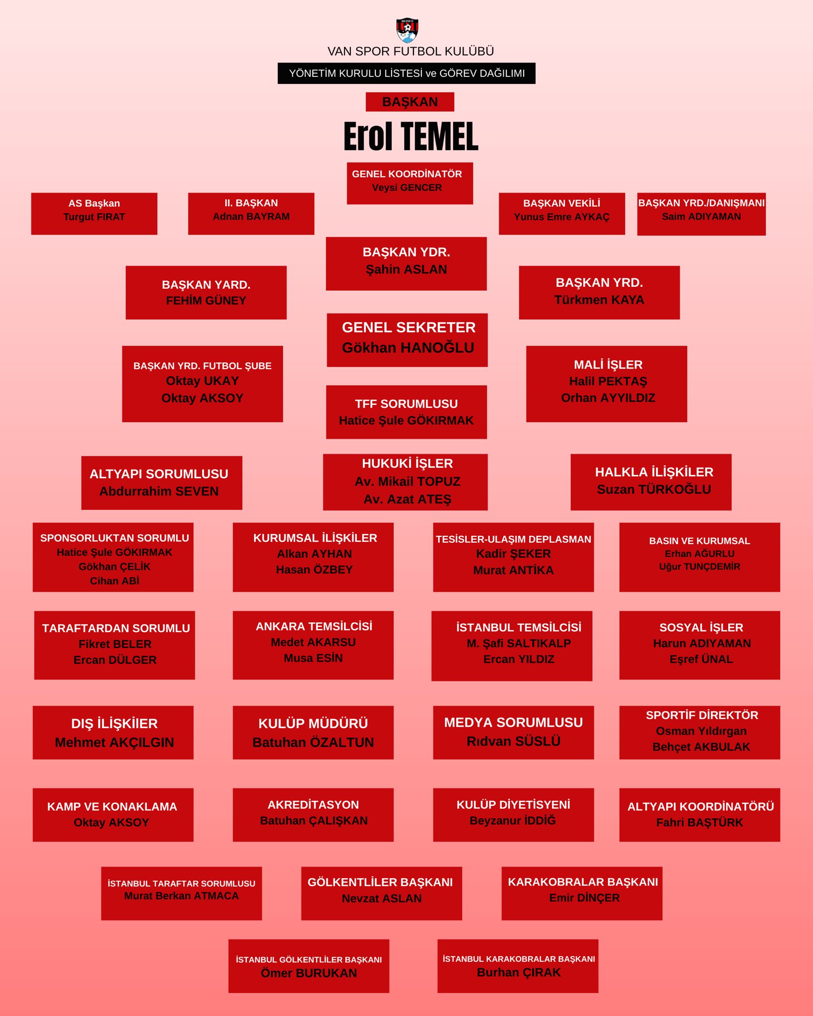 Vanspor'da başkanvekili koltuğu Yunus Emre Aykaç'a emanet edilirken AS başkan Turgut Fırat oldu. Vanspor'da ikinci başkan Adnan Bayram olurken başkan yardımcıları Şahin Aslan, Fehim Güney ve Türkmen Kaya oldu. Saim Adıyaman ise hem başkan yardımcısı hem de başkan danışmanı görevine getirildi. Kulübün Genel Sekreteri Gökhan Hanoğlu olurken kulübün Genel Koordinatörü ise Veysi Gencer oldu.