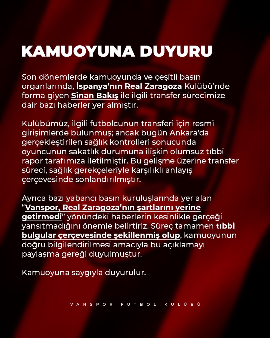 Ayrıca bazı yabancı basın kuruluşlarında yer alan "Vanspor, Real Zaragoza'nın şartlarını yerine getirmedi" yönündeki haberlerin kesinlikle gerçeği yansıtmadığını önemle belirtiriz. Süreç tamamen tıbbi bulgular çerçevesinde şekillenmiş olup, kamuoyunun doğru bilgilendirilmesi amacıyla bu açıklamayı paylaşma gereği duyulmuştur.
