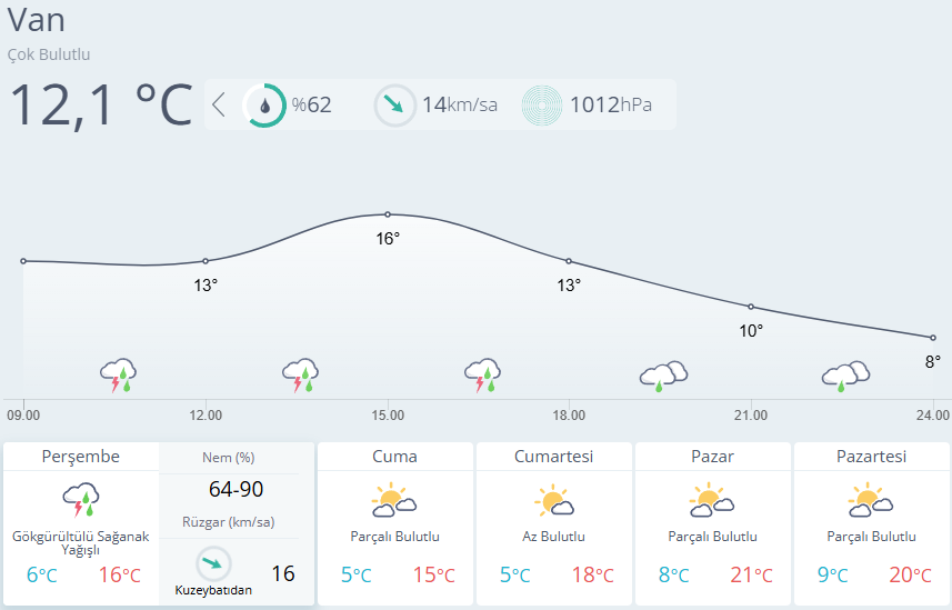 VAN İPEKYOLU VE TUŞBA: Çok bulutlu, aralıklı sağanak ve gök gürültülü sağanak yağmurlu olması bekleniyor.