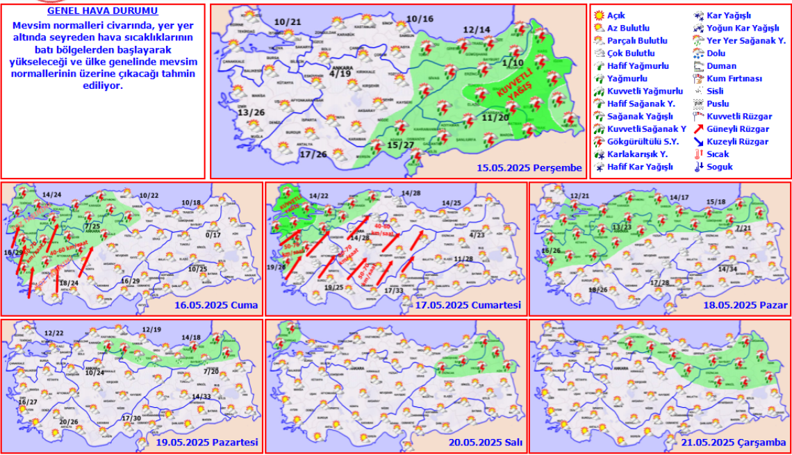 Meteorolojiden yapılan tahminlere göre: Yurdun doğu kesimleri ile zamanla batı kesimlerinin parçalı ve yer yer çok bulutlu, Doğu Akdeniz, Doğu ve Güneydoğu Anadolu, Doğu Karadeniz, Ordu ve Tokat çevreleri ile gece saatlerinde Çanakkale, Manisa ve İzmir çevrelerinin yağışlı, diğer yerlerin az bulutlu ve açık geçeceği tahmin ediliyor. Yağışların, Doğu Anadolu'nun doğusu Van ve Hakkari’nin yanı sıra Osmaniye, Diyarbakır, Siirt ve Batman çevreleri ile Adana'nın doğu ve Kahramanmaraş'ın batı kesimlerinde yerel olarak kuvvetli olmak üzere yağmur ve sağanak, yer yer gök gürültülü sağanak, ilk saatlerde Doğu Anadolu'nun kuzeydoğusunun yüksekleri ile Doğu Karadeniz'in iç kesimlerinin yükseklerinde karla karışık yağmur ve kar şeklinde olması bekleniyor. Hava sıcaklığında, önemli bir değişikliğin olmayacağı, yurdun kuzeydoğu ve doğu kesimlerinde mevsim normallerinin altında, diğer yerlerde mevsim normalleri civarında seyredeceği tahmin ediliyor. Rüzgarın yurdun kuzeybatı ve güneydoğu kesimlerinde güneyli, diğer yerlerde kuzeyli yönlerden hafif, ara sıra orta kuvvette, yağış alan yerlerde yağış anında yer yer kuvvetli olarak esmesi bekleniyor.