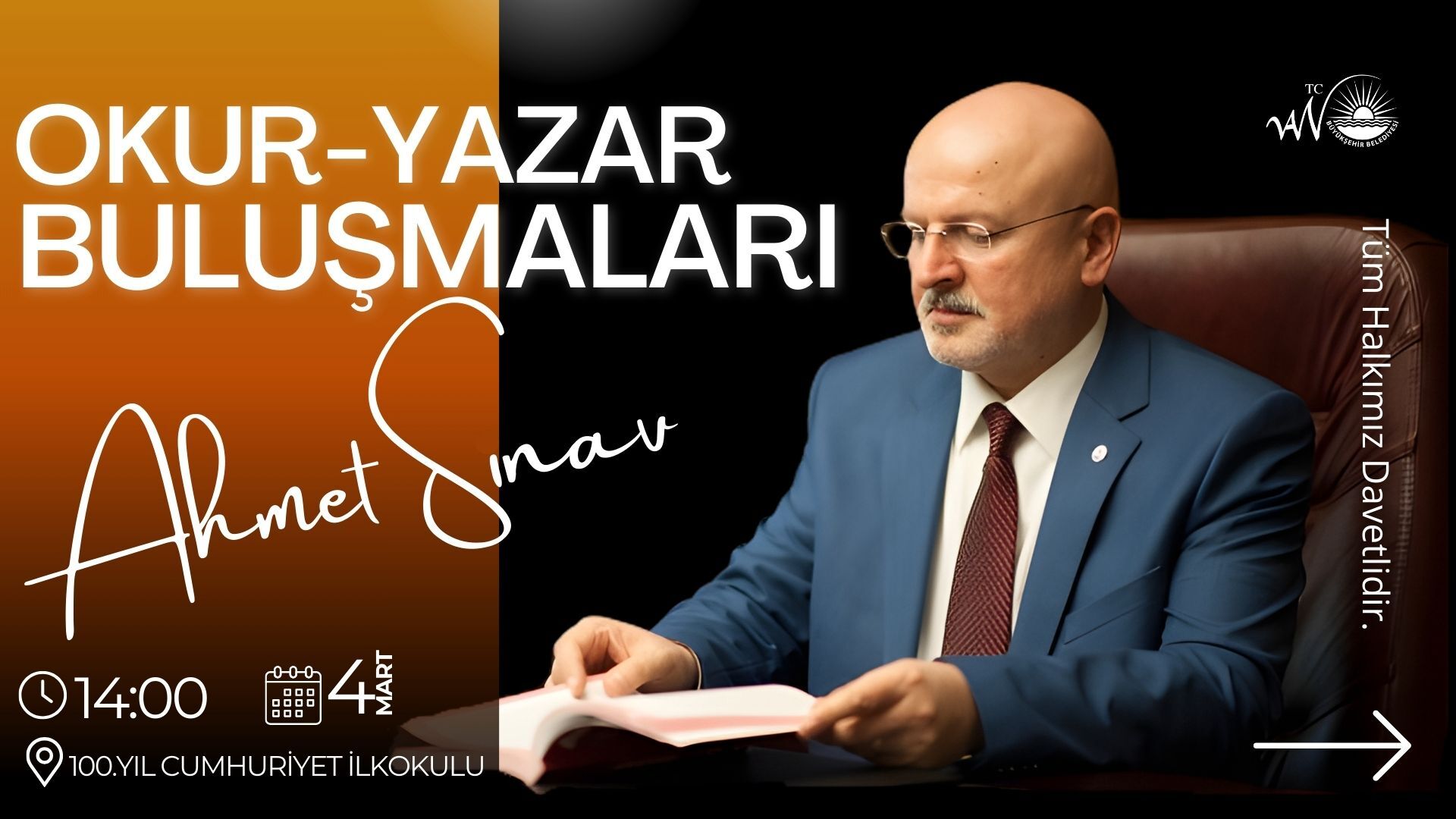 Bu kapsamda 4 Mart Çarşamba günü saat 14.00’te 100.Yıl Cumhuriyet İlkokulu'nda Yazar Ahmet Sınav da okuyucuları ile buluşacak. Yazarlık serüveni ve eserlerini katılımcılarla paylaşacak olan Sınav, soru-cevap bölümüyle de okurları ile sohbet edecek, ücretsiz söyleşiye tüm vatandaşlar davet edildi.