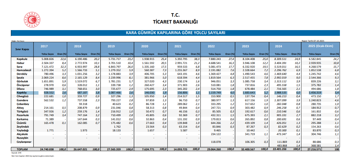 Van’ın İran’a açılan en önemli kapısı olan Kapıköy Sınır Kapısı, 2025’in ilk 10 ayında yoğun bir hareketlilik yaşadı. Ticaret Bakanlığı'nın verilerine göre, Ocak ve ekim aylarında toplam 1 milyon 456 bin 319 kişi sınır kapısından geçiş yaptı. Bu rakam, geçen yılın aynı dönemine kıyasla belirgin bir artış gösterirken, Van’ın turizm ve ticaret potansiyelini bir kez daha gözler önüne serdi.
