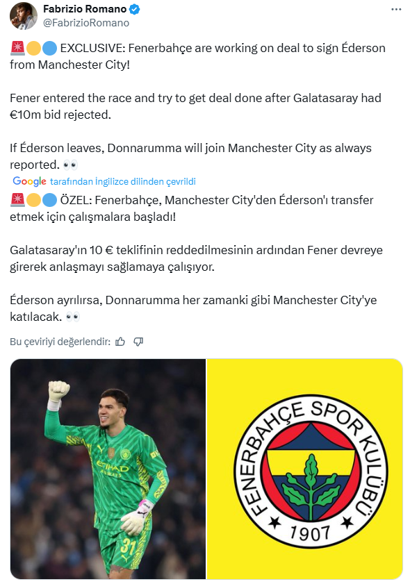 Fabrizio Romano'nun haberine göre; Süper Lig devi Fenerbahçe'nin Manchester City'den Ederson'u transfer etmek için çalışmalara başladı. Haberde, Galatasaray'ın 10 milyon euroluk teklifinin reddedilmesinin ardından Sarı-lacivertlilerin, 32 yaşındaki Brezilyalı kaleci için devreye girdiği belirtildi.