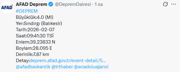 Afet ve Acil Durum Yönetimi Başkanlığı (AFAD), merkez üssü Balıkesir'in Sındırgı ilçesinde saat 09.41'de 4,0 büyüklüğünde deprem meydana geldiğini açıkladı.