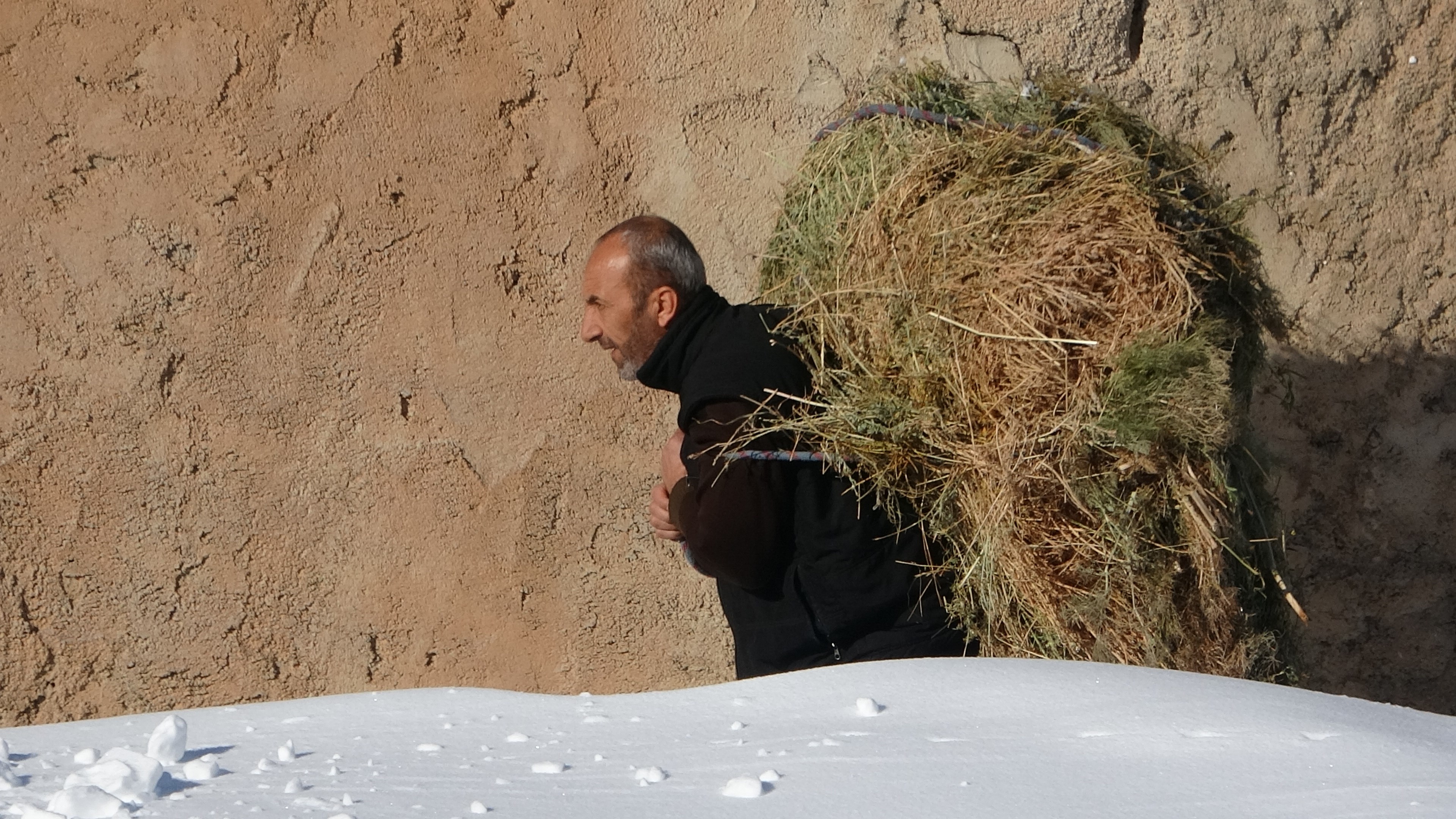 İlçeye 30 kilometre uzaklıktaki Teknecik Mahallesi'nde günün ilk ışıklarıyla işe koyulan besiciler, sırtlarında ve kızakla taşıdıkları otları, karın üzerine sererek ağılda beklettikleri hayvanlarını bu alana getirerek gün boyunca yemliyor. Günde 2 kez dışarda yem verdikleri hayvanlarını akşam saatlerinde yeniden ağıla götürüyorlar.